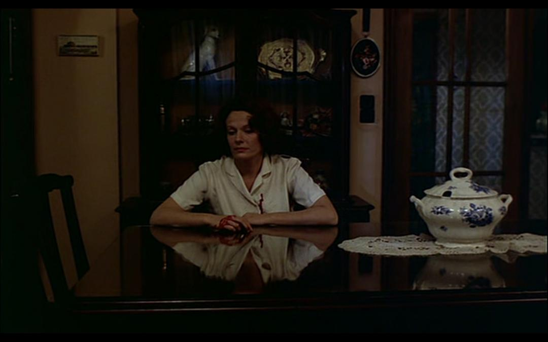 阿克曼曾经说到电影的最后一个镜头:“这不是让娜·迪尔曼的秘密,这是德菲因·塞里格的秘密。”那么我再引用友邻 Anni的一句话:“我们之所以觉得有秘密,是因为有差异。”影片最后,这位女性坐在餐桌前,手上、衣服上都带着血。剧场般的蓝光在客厅里闪烁,我们还是和她隔着一张桌子,那上面印着她的倒影,也记录着她曾在这里做的事——把钱放进陶瓷罐里,铺桌布,摆刀叉······可是现在,她与这些事之间有了差异,甚至与刚才的谋杀、变幻的蓝光,都存在差异。
