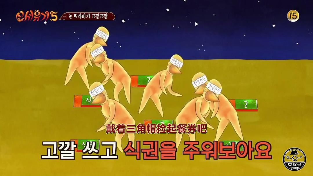 游戏规则:制作组向天空抛洒6张餐券,其中真假餐券各3张,拿到餐券去抓住PD的手确认,如果是真餐券就能脱下三角帽用餐,如果找不到就要戴着三角帽用餐。