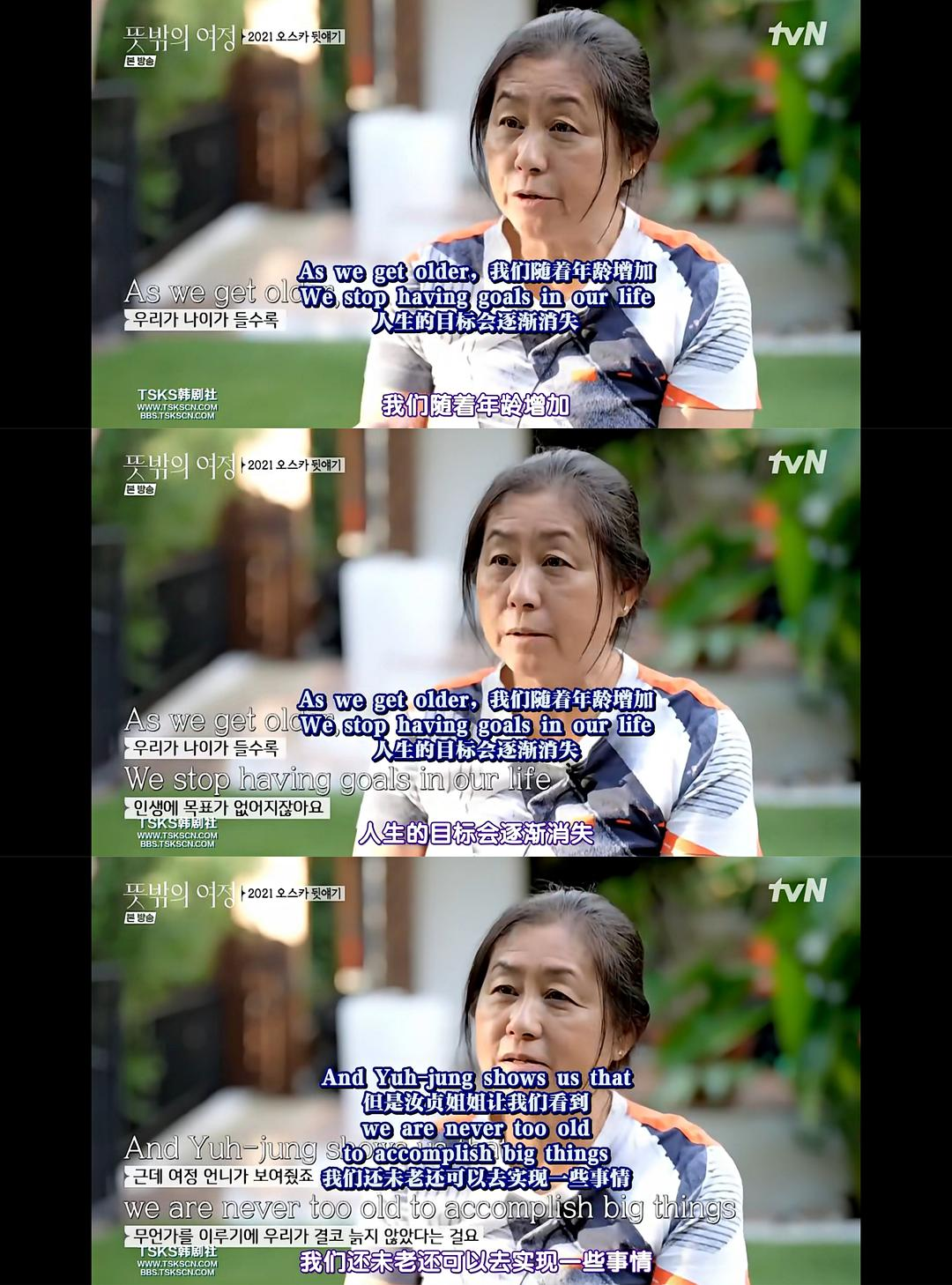 尹汝贞老师能在这个年龄获得成功离不开女性朋友的帮助,离不开韩国娱乐的发展。一切都这样水到渠成了。特别是自己还如此努力,提前写好访问回答,体贴工作人员,感恩周围人的帮助,觉得没有她们就不会有现在的自己。而这一切我觉得最重要地就是她离开的婚姻的桎梏,没了婚姻的束缚才能做到这一切。所以在东亚女性要成功真的得不要结婚啊。尹老师真的太好了,好有魅力。n做完一整天的采访和经纪人互贴膏药,两人都哭了。好细节,真实n好好照顾身体,长命百岁,继续演下去!nupdate episode02n想着每周一就可以看到更新了,赶快趁午休看完。真是觉得翻译组好厉害。辛苦了n第二集主要介绍了尹汝贞老师的两位老友花粉红和静子。静子是一名动画总监,32岁才来到美国,已经有36年了。觉得和尹老师虽然是朋友,但还是被她所激励鼓舞。在70多岁的年纪还能获得奥斯卡奖,而且还在继续努力地工作,这样的精神太强大了。而且静子还很大声坚定地说很喜欢自己的工作,想要通过创作让孩子们有更丰富的想象力。在问尹汝贞是如何背那么多的台词时。尹老师说:这是很难的事,很大的压力。没有什么捷径,只有不断练习,重复很多次,花很多时间。