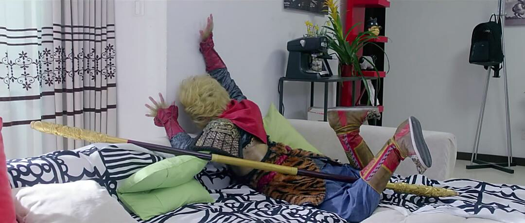 镜头转到一个现代城市熬夜小白领的小房子里,一小伙正在通宵完成工作,此时窗外一亮,一个猴子窜了进来把小伙吓得够呛,悟空看见小伙以为是唐僧就叫了一声师傅,小伙下意识地拎着衣服就跳窗而出,还好带着光环不然从三楼跳下来不死也残废啊,说着就往外跑,悟空化作一道光追了上去。