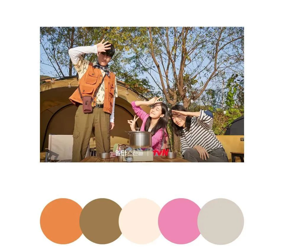 比如材友去露营时的造型,和后面帐篷的颜色、树木的颜色都有呼应,所以虽然身上的元素多,但并不会乱七八糟,画面和谐而有亮点~