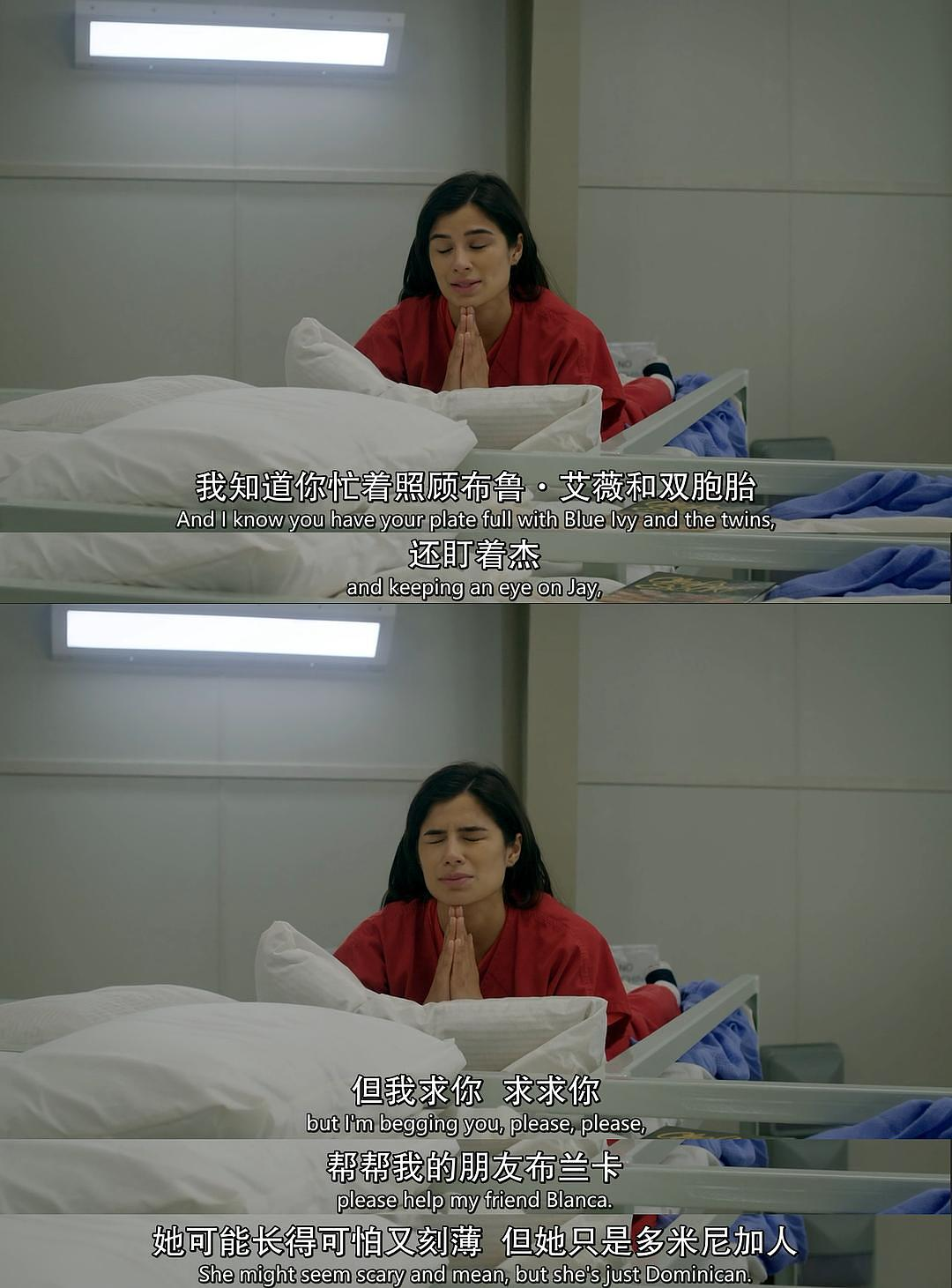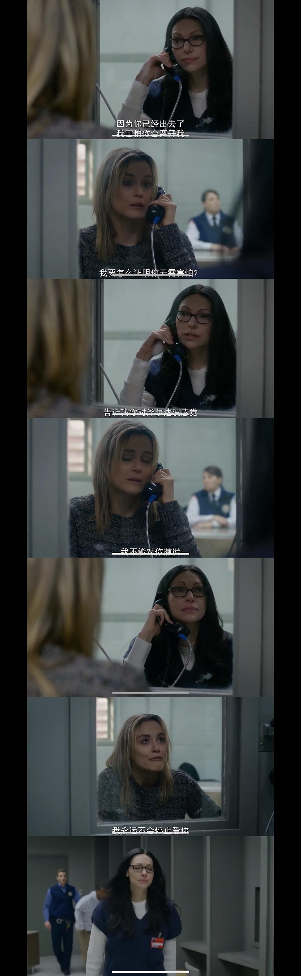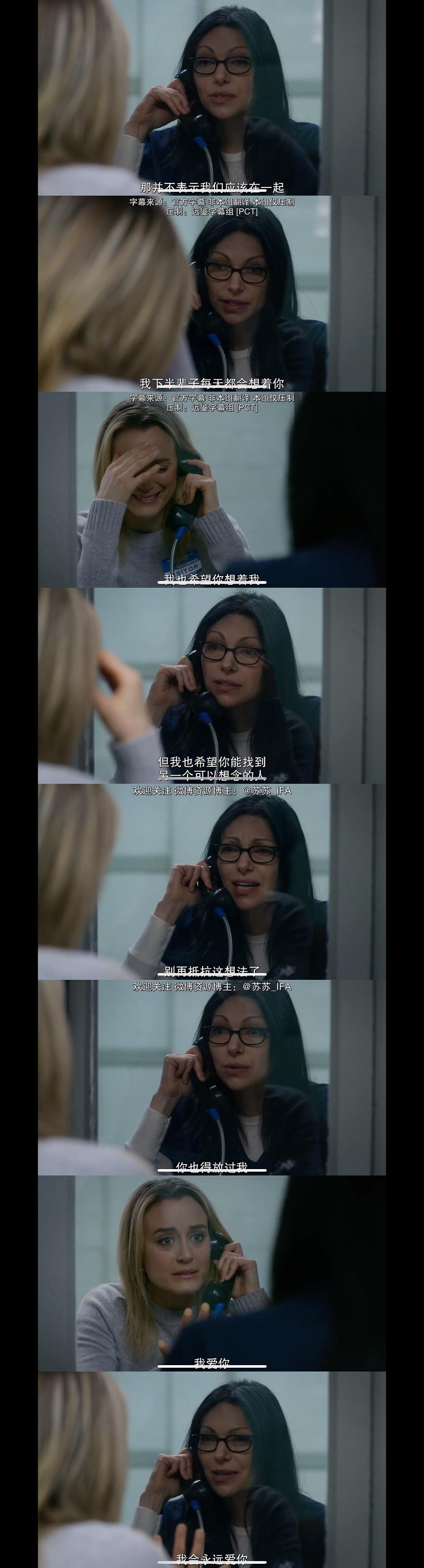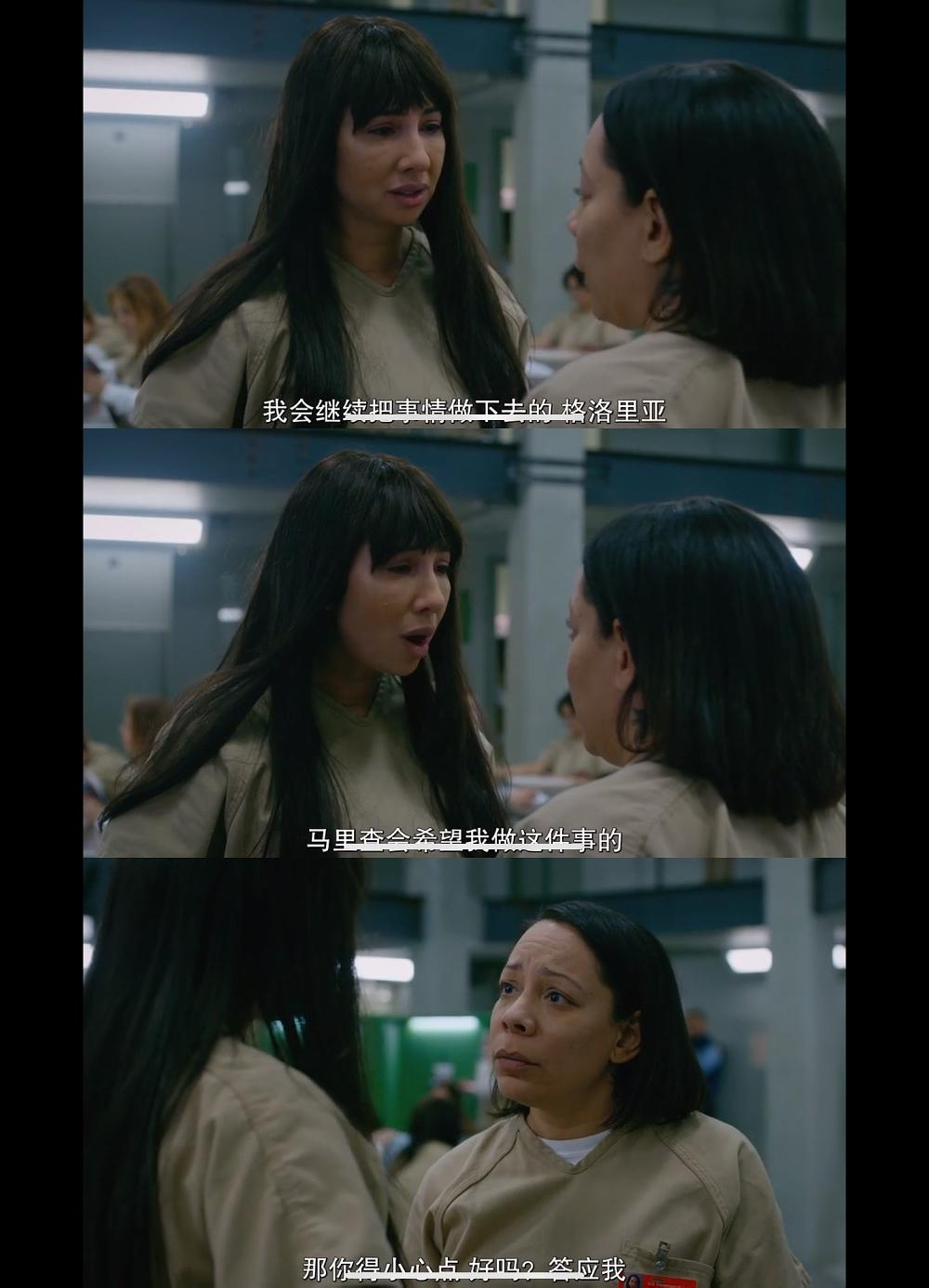 在拘留所的时候,她把电话号码分给每一个人,她本可以远离这些的,但是她没有这样选择,她会为了布兰卡祈祷,在这里,她们是互相的依偎,这个牵手的动作实在是太感动了,有人和你一起绝望,一起承受。