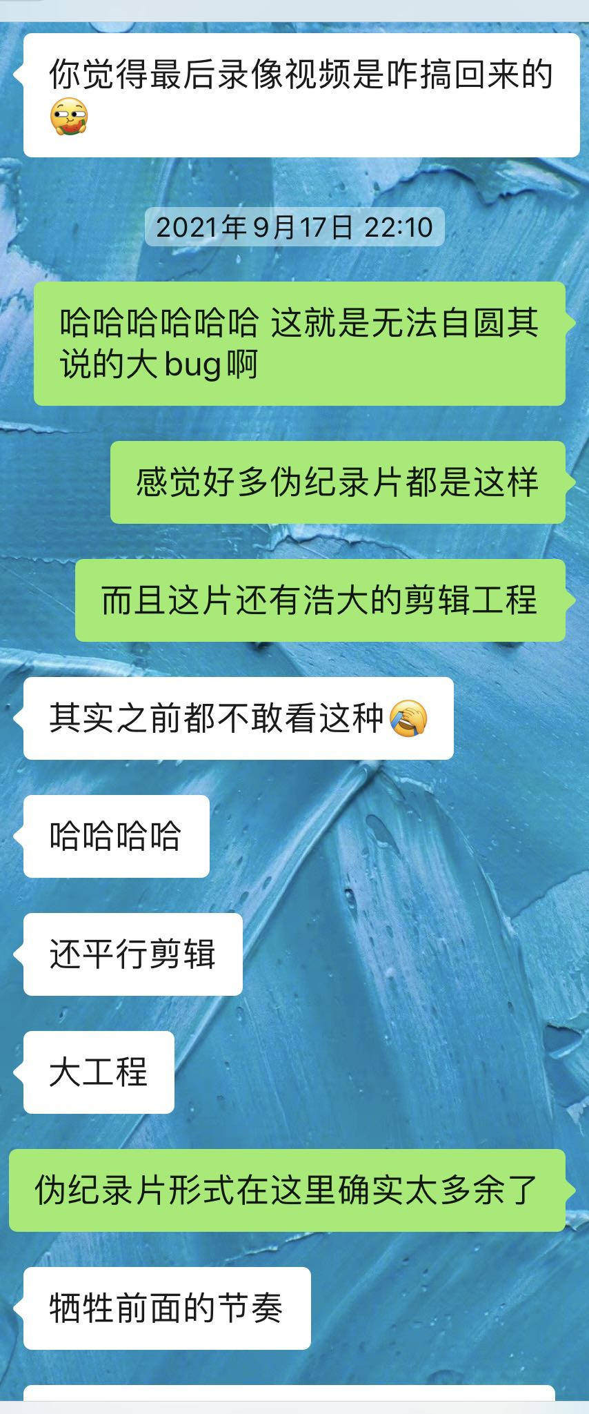 妳的世界几点 剧作上很扎实渐循渐进,伪记录拍摄身临其境,细节道具做的都很好。但我感觉创作理念可能有点问题,既然一开始拥抱了真实,就不该最后舍弃真实。结尾高潮可以歇斯底里,群魔乱舞但应该有一个度,度即真实。没有了度,前面苦心经营的记录感瞬间崩塌了,反而最后有些兴味索然了。