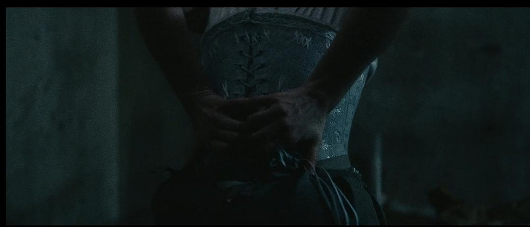 虽然对于束腰的描写本身并不新颖,但是阿妮在这部电影中的创新还是让我感到眼前一亮的。这部电影不像大多数双女主的电影,两位女主有许多时间在一起。而这一部由于两人身份的差异,在许多镜头中两人是分开的。电影中的几次双镜头拼凑就很巧妙地利用上了这一点,而两人同时解束腰的那一段就显得尤为精彩。小黑屋的经历对于尤金妮而言更像是一种涅槃,正是这段她最为痛苦的经历使她的反抗意识达到了高潮。而发疯似的解开束腰就是最好的体现。这一段她的情绪是热烈的,是在长久的压抑后的瞬间爆发。而珍妮薇芙的表现就相对而言平和许多,对于她的描写更加注重解下束腰的困难,以至于在解下后都要先休息一阵。