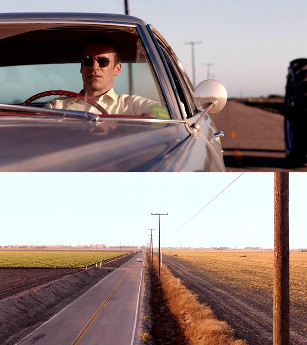 Don本來似乎要回新公寓(裝潢居然是Meredith幫他想的,雖然她很可愛,但我真不希望Don又找個祕書),卻開上高速公路。他開了數個小時,直到天黑。夜路上,Cooper的幻影出現,與Don對話。Don提到了在路上(On the Road)這本書,Cooper說他沒讀過,又說Don不要又去找個不認識他的女服務生,原來Don是去威斯康辛Diana的家裡探口風。