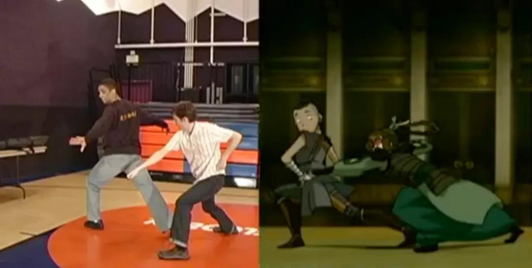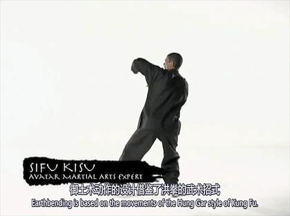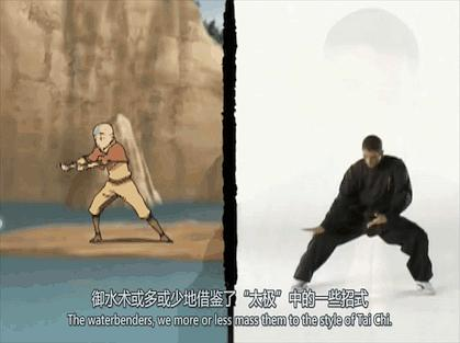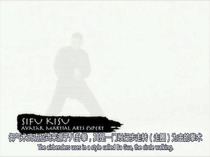 水宗明显是模仿了太极,里面设计的阴阳相转,一推一拉,做得都很有味道。而片子火宗皇叔艾龙将军的打斗更是精彩,有一集里他在永固城里轻易的扛倒了一个抢劫他的人,外行可能都看过去了,但是,其实他那招的应用万万全全是中国武术的近战用法,八极拳有类似的用法,八卦掌也有类似的用法。而在苏姬第一次出场的那一集里,打她未来男朋友的那个动作应用,也是正宗的中国武术的用法。都是以巧以劲,而非用力。而艾龙将军对丹田气海的解释,更令人叹服。最绝的是,铮铮教安学习火宗运气时,说的要领,竟然完完全全是内家拳的吐纳法。。。看到这的时候,我都惊了。。其实在这部动画里,如果抛除绚丽的元素场面,每一派的招式都是有迹可循的。大体而言,水宗基本是太极的动作,火宗的架势明显是八卦掌(晕,可惜只是架势而已,一动手就变成喷火小人了~),气宗的棍法是根据少林改的,而土宗则是明显的外家拳动作。为了说明这部动画里对打斗动作设计的精细,我在此说一个细节,有一集是土国的干净族跟脏族相遇,两个族长持刀剑打斗,我一看干净族族长的出剑就被镇住了,这些动作和出招绝对一点也不是瞎编的,他的剑一出手就与手腕是一条直线,从下往上斜出,用腰力拧劲,这是典型的中国剑法,别无二家。其实现在的电影电视剧中,能够注意到这些细节的,除了李连杰等几名有一定武术功底的演员外,很少有演员导演能注意到这些了。他们总是刻意去模仿武术动作,或制造花哨而可笑的绚丽动作,但却都不得武术的要领精髓,而这部动画却能做到这种地步,真是令那些古装剧演员汗颜。