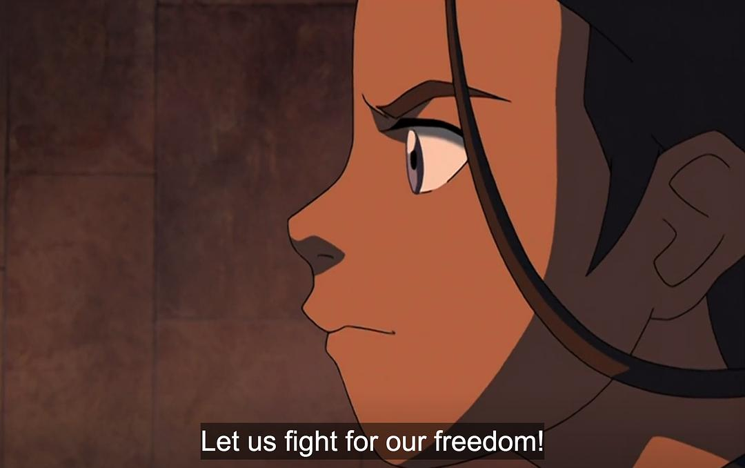 Katara知道了老人背叛致使Haru被抓走,毅然决定去营救他。她发现Haru与许多其他土族人被关在一艘大船上。明明可以只带着Haru逃走,但她无法对剩下的人坐视不管,她决定让这些人一起团结起来,反抗火族,并发表了一番慷慨激昂的演讲。