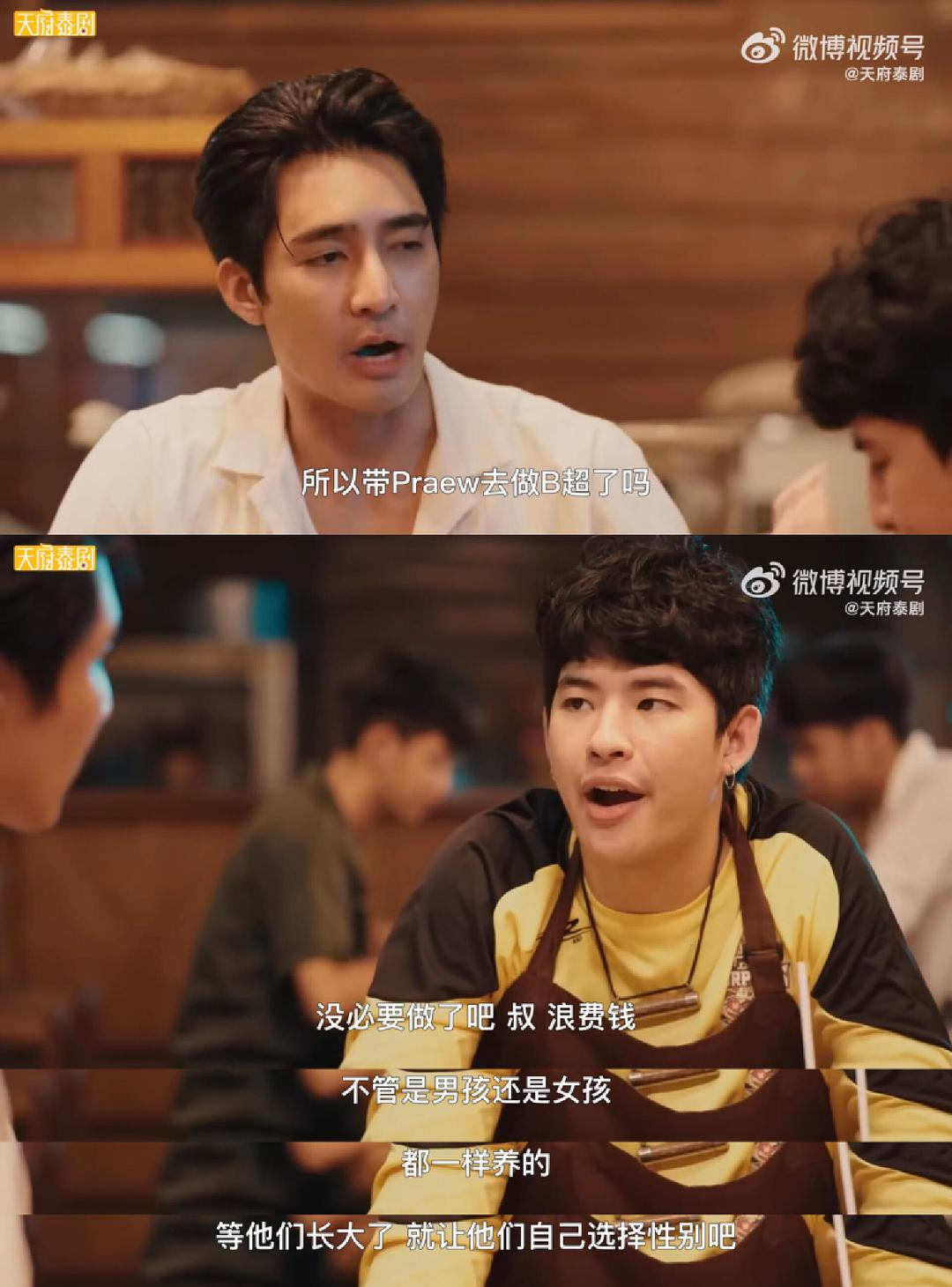 这部剧里我还看到了腐剧中家长们的进步。泰腐拍了快10年了(姑且从第一个现象级的《为爱所困》算起吧,如果从更古早的暹罗之恋起算,20年都有了),如果剧情的矛盾点还集中于出柜和家庭矛盾,那就有点太说不过去了。且不说时代在进步、骄傲运动风起云涌,就从剧情本身而言,观众也看腻了。