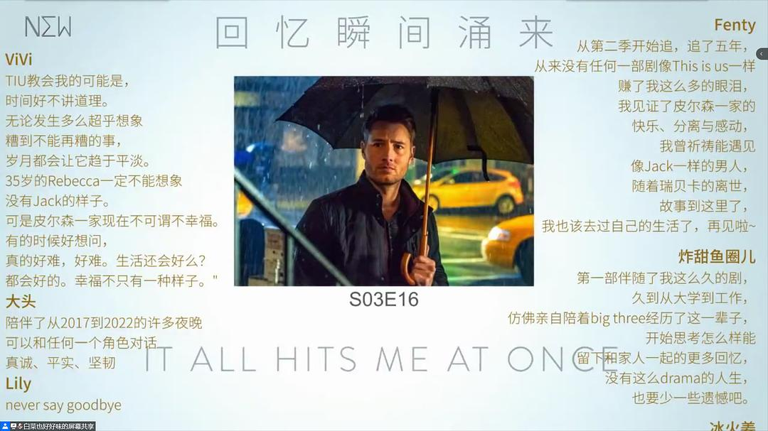 我们看 TIU 的这五年,已经陪着他们经历过很多次失去,也许最后一集,我们要再经历一次失去 Rebecca。无法想象自己在生活中面对那一天,希望大家都照顾好自己的身体,平安健康,我们和父母一起面对老去,一起做幸福的老头老太太吧。