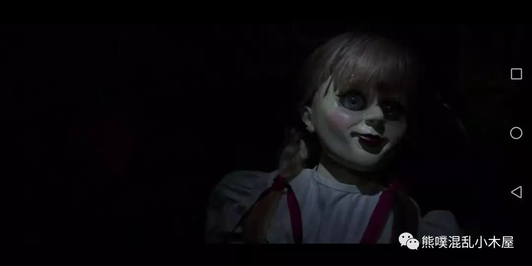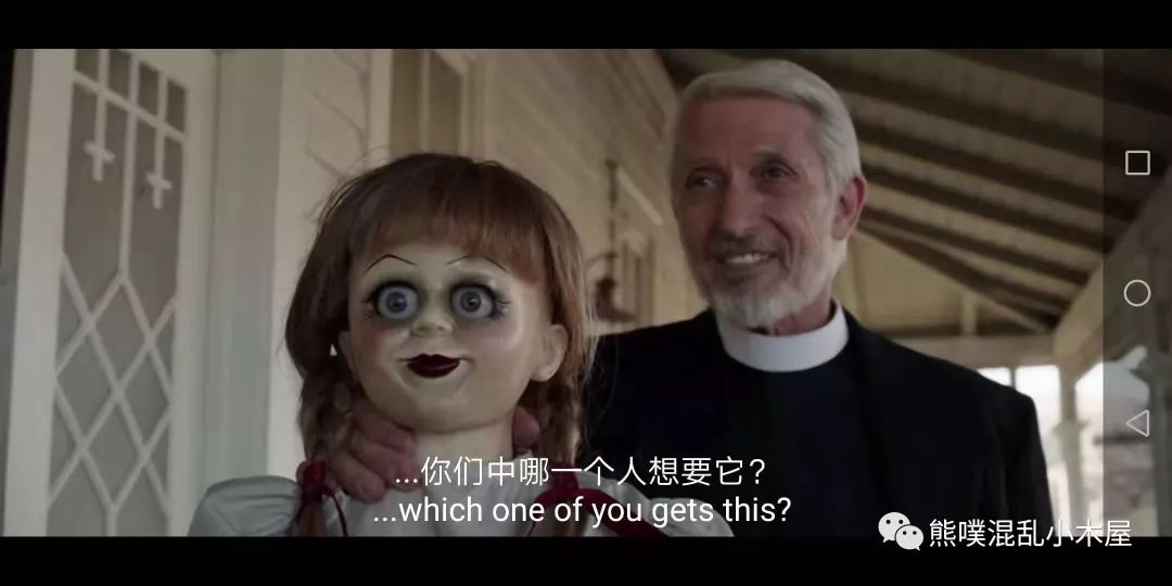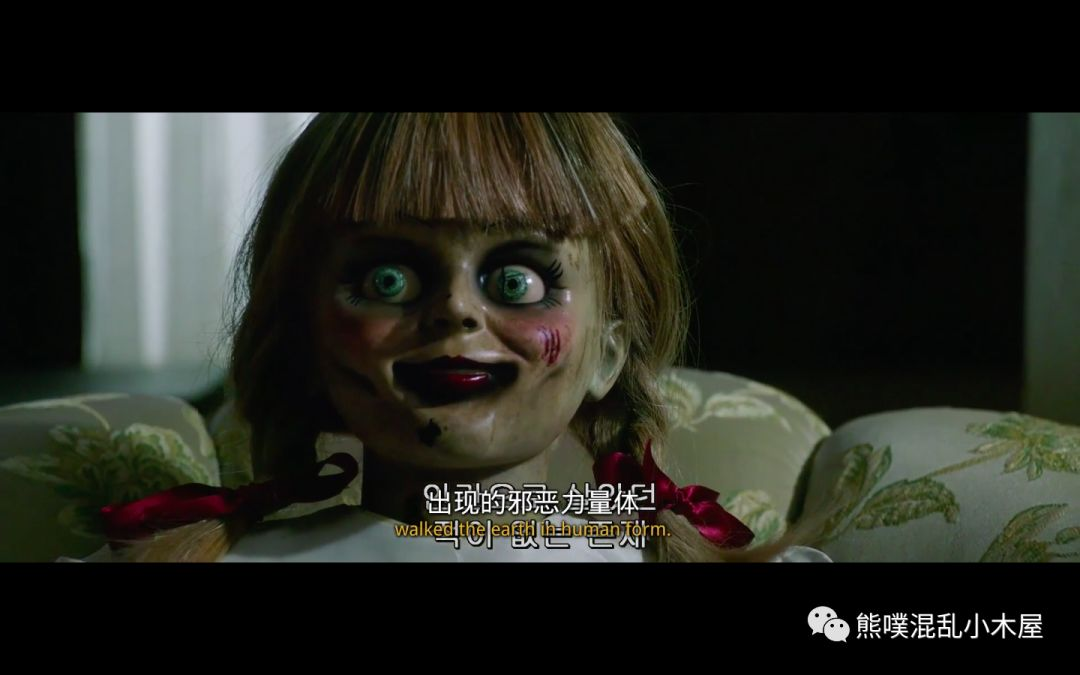 恶魔转移到女孩身上,房间和娃娃被驱魔之后。忽略这个字幕,我总觉得这里的安娜贝尔的脸比我印象中胖了许多……可能是假发被往后拉,导致脸部留白增加,毕竟刘海是瘦脸神器。再然后就是,细挑眉真的显脸胖。这个时候附在安娜贝尔上的恶魔杀掉了穆林思夫妇,又通过迫害小女孩得到了身体,就恶魔的意义来讲,可能安娜贝尔只是单纯的“吃胖”了。