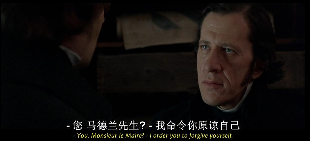镜头一跳,沙威负荆请罪剧情。我怀疑这里删了镜头,毕竟片子太长了,所以我们就突然看到他来请求开除了。当然,这也是马德兰意识到有无辜老头要为冉阿让替罪下狱的时候。这里纳什的表演很好,把原著的精髓表现了出来,然后尼森的……考虑到本片冉阿让神奇的人设,我真说不好他听到沙威告发他的时候这表情是“HOW DARE YOU”似乎马上就要冲上去暴揍沙威,还是担惊受怕……