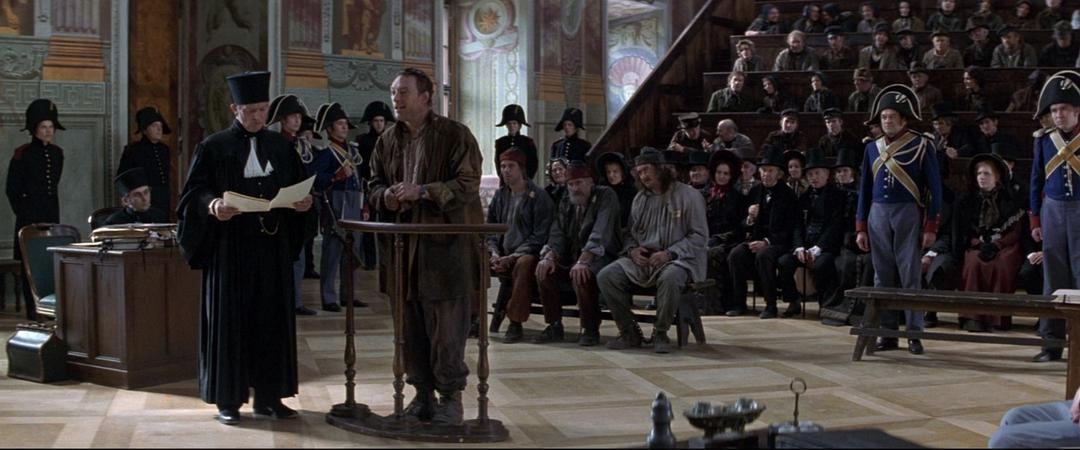与芳汀告别后,冉阿让就启程去了阿拉斯的法庭。这里出现了全剧最佳改编(其实就是照着原作拍,不过细节到位)。原作花了两个章节描述纠结的冉阿让,去,还是不去,在本片里只留了最后一段——他来到法庭,座位满了,他回头准备离开,面色带着一丝庆幸,然而就在此时,门房说:政府官员可以进。