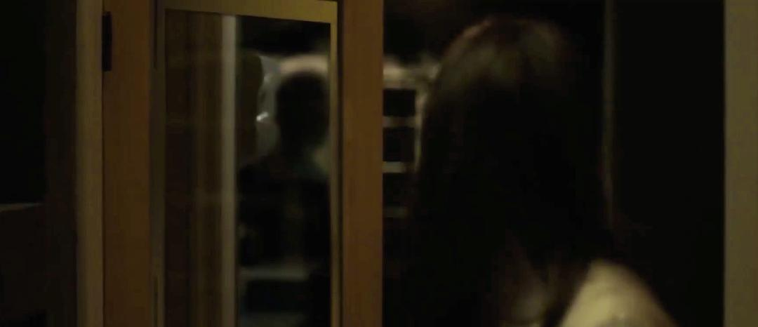 睡前,女主听到似敲门声,这是电影中的恶灵第一次来访。女主下楼,发现了恶灵,此时的恶灵只是玻璃反射出的人影。