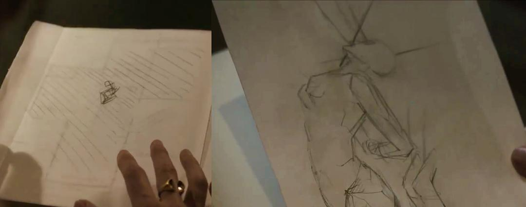 女主越看越难过,她激动地收拾起丈夫的遗物。这时她发现了当年建造房屋的图纸,画有镜面房的图样(标记:Reverse floorplan),还有一些女主看起来匪夷所思的笔记: