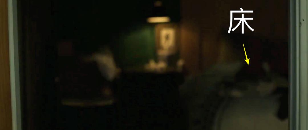 女主发现背后水的脚印。这时镜头上移,床在镜头右侧,这是现实房屋的方向。