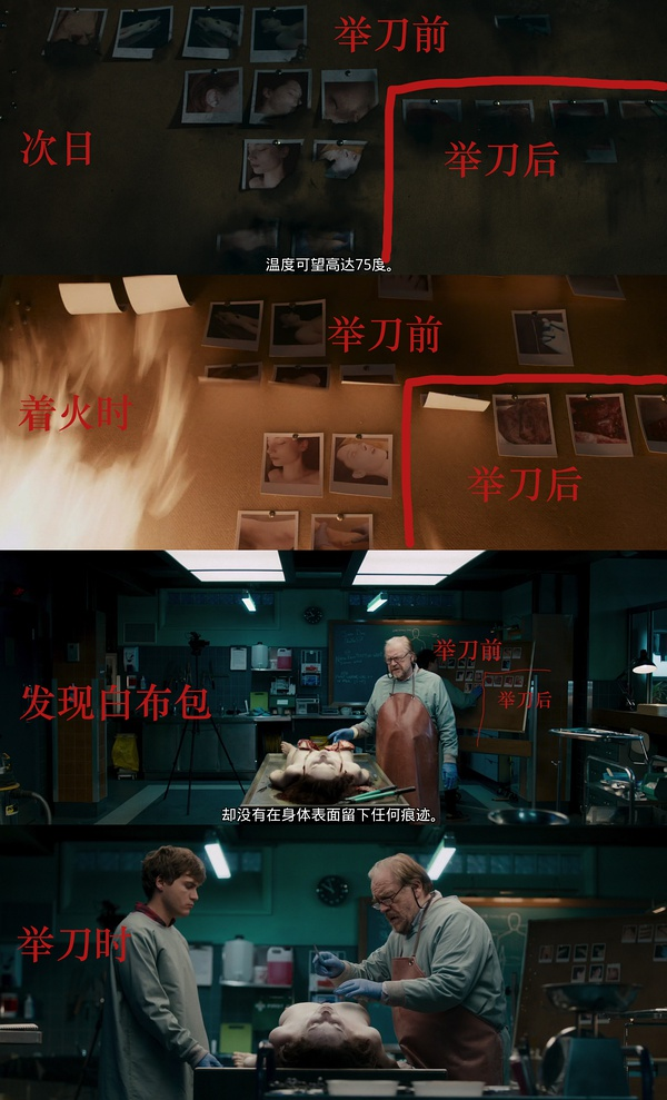 次日保安官进入解剖室,镜头带过照片墙,照片的分布和着火时是一样的,只是右边的照片被烧了很大部分,但还是能分辨出来,就是奥斯汀拍内脏的那些照片。所以,女尸是被解剖过了,只不过她自愈而已。nn--------------------------------------------nn前两天写完评论,豆友们发表了不一样的看法,我看了以后,深觉自己要反省,的确看得不够仔细,今天有时间,再续写一下。nn我之前选择了“照片墙”这个点,但只是匆匆贴上两张图,论据不足,在此,有必要捋出一条照片墙时间线(多图预警):n解剖室内景部分刚开始,爷俩在处理一焦尸: