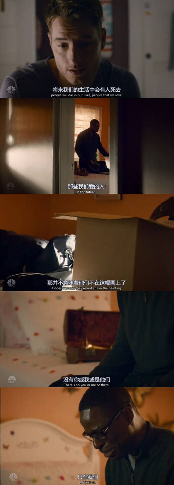 一个家庭的历史,在时间长河中无足轻重,爱却从未中断。父母曾生活过的生活,渐渐成为了我们今天的习惯。他们教会我们爱,我们又将这爱扩大给了子女。杰克与丽贝卡在某个周日的超级碗比赛怀上了凯特,从此周日都是一家五口一起看比赛,戴在爸爸头上的幸运帽,又戴到了凯特的头上。