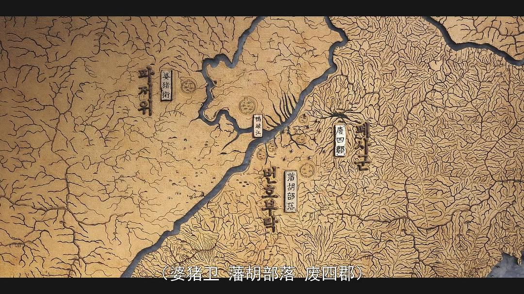 在本片开头和29~30分钟,分别出现了地图,里面标出了废四郡、满浦、婆猪卫等地名或部落名。