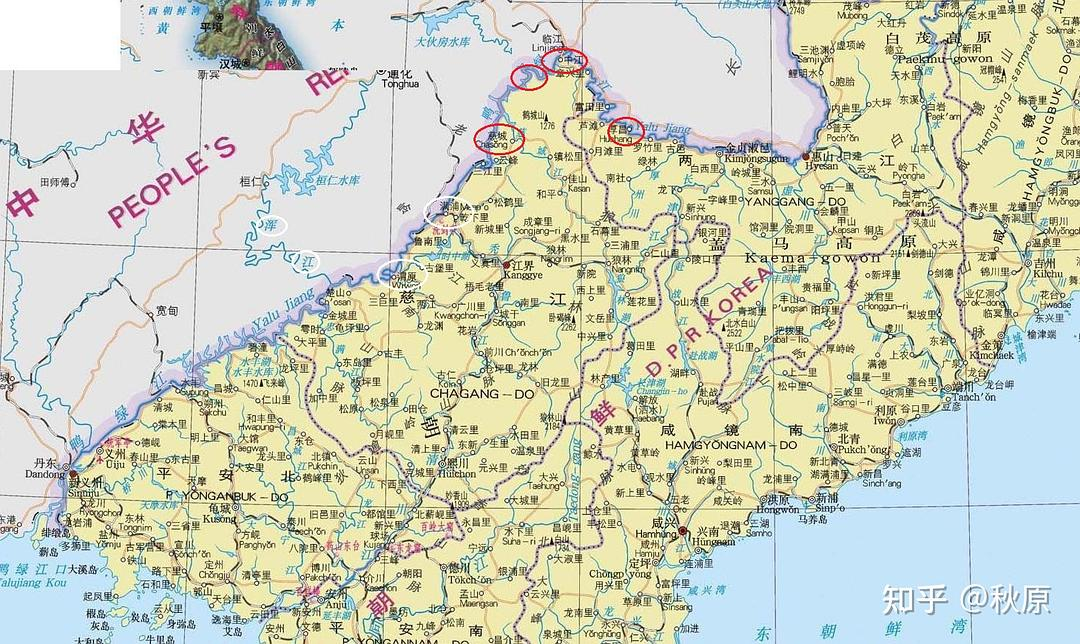 我还用白圈标出满浦、渭原,中国辽宁境内的浑江。这些地点同样极为重要,在后文会多次出现。