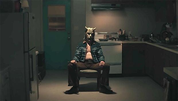 Grabber最终都要把小男孩解决掉,显然不用再担心暴露自己的真面目。可当他被小男主Finney把面具打翻掉时,他立即疯狂地捂着脸。