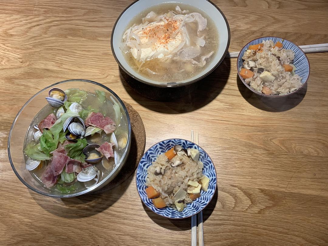 本集料理来自3卷 #21:五目饭、肉豆腐、培根高丽菜蛤蜊蒸、韭菜豆芽加芝麻凉拌、滑子菇鸭儿芹味噌汤。