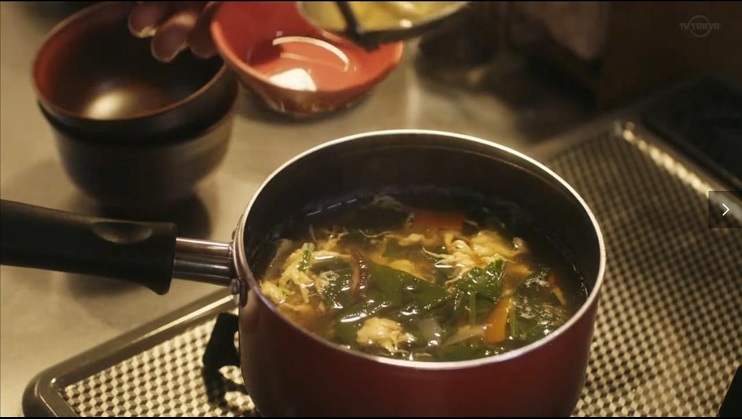 接着还有一闪而过的贤二手作料理,出自11卷 #84:韭菜炒猪肝、蛋花汤。
