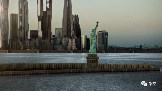 因为全球变暖,极地冰盖融化,导致海平面显著上升。为保护曼哈顿,人类建了一道大坝。