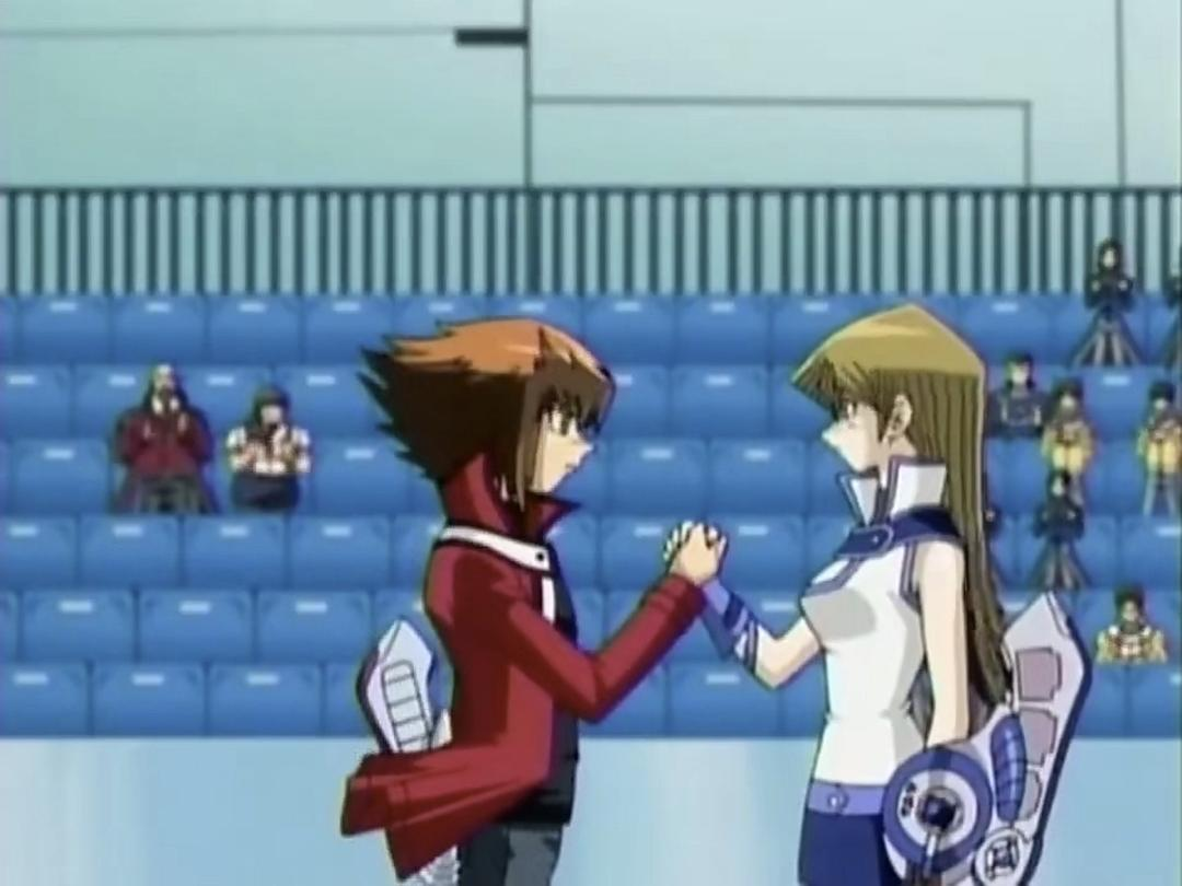 在组队结束后的那个晚上,十代回到红宿舍的途中,灯塔下,明日香早早等候在那里。明明有好多想说的话,到嘴边时,明日香只好应付了事。十代以经典动作进行回应,从今以后,二人再无交集。