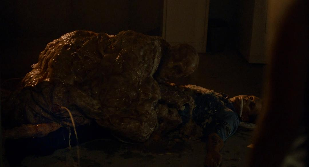 再砸窗进了一间房子,电视无信号都是同一个画面,女主在地下室发现氧气筒,又看到了一个身体都变成白浆的人在另一个人身上,上来看到男友眼睛也变了,