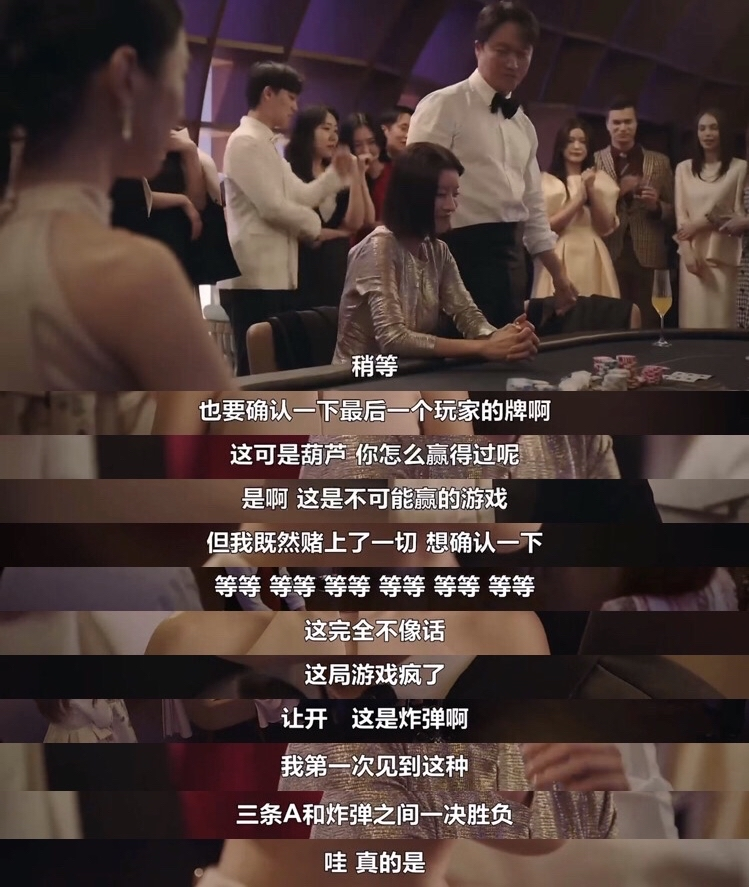 莱尔在世云庭赌局上梭哈(有没有人看到这幕想到韩志胤的,暴露年龄…),在场的人只以为那是莱尔陈述自己行为的字面义:一局定胜负才能结束游戏。画面之外的观众才知道莱尔所说的乃一语双关。