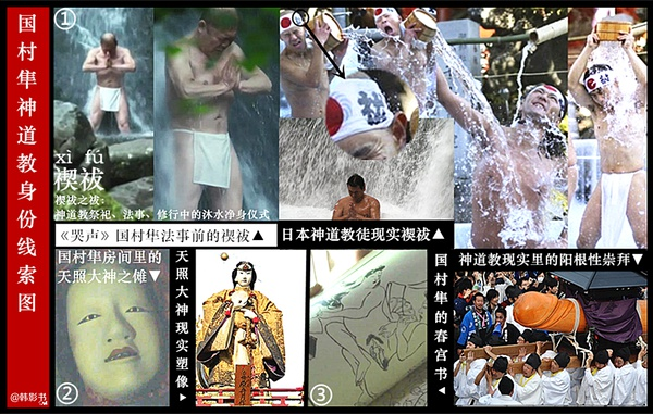 由上,也能理解了一点:虽然给足了元素特征,但剧情中、导演公开采访时,极少直接说出片中涉及的宗教名称,尤其是神道教的名称,就连萨满都用「土俗」之称代替了。