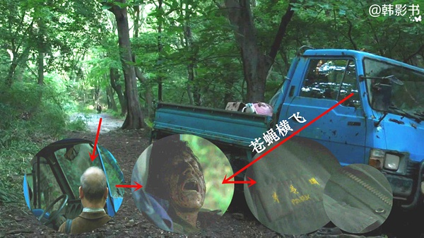 ——飞蛾,在民间有魂灵化身的说法。在黄政民将要逃走的时候,遇见的这些飞蛾,其实是所有被害过的生命,在报复黄政民(照片在他车后)。▼