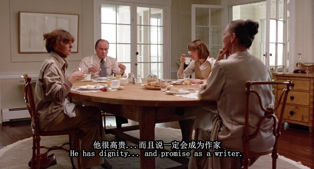 值得一提的是,这一重生恰恰是通过被海“弹回”而实现的:她没有越过沟壑,却仍与他人相遇。或许,关于海-外部的隐喻只是来自interior的一厢情愿,海的意义从未真正澄明;又或许海确是生命的纽带,女儿借此得到了母亲的“附身”,正如台词中多次提及的那样("My whole life, I've only wanted to be her.")。在最终的重生中,母亲成为她长久找寻的“自我”。这里的“母亲”所占据的近似于某种位格,“母亲”是投海死去的生母,是救起她的继母,也是已然怀孕的她自己——一种历时的(代际的)与共时的命途,通过“母亲”缝合在一起,这一缝合建立了新的自我。这一自我固然无法逾越沟壑,却不致与人隔绝。这便是Woody Allen的一贯态度,悲观却又浪漫主义。他似乎在说,人因皆被判为孤独而奇妙地相连。