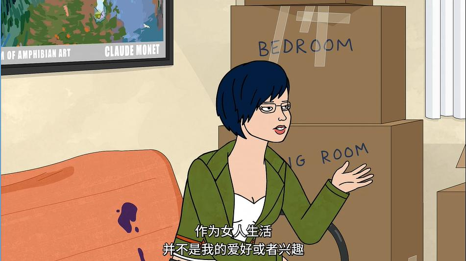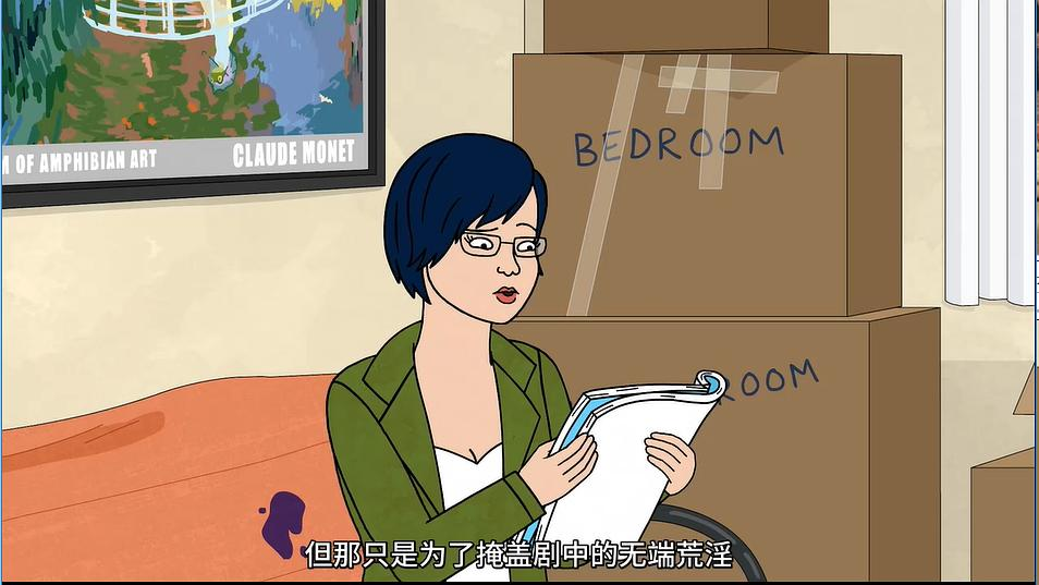 其次,Mr.Peanutbutter对Diane还是有些不一样的情感,Katrina和Jessica在和他分手后,每次见面多少都有些剑拔弩张,完全无法坐下来说话,而对Diane他似乎一方面有一定的愧疚感存在,另一方面还保留着一份情谊(这一点直到他在无意识间脱口而出才被他自己真正意识到),但二人的感情似乎也真的是走向终点了,即便可以have sex(第二次还是在呼应第四季中两人只有争吵状况下才能完全释放的设定)。