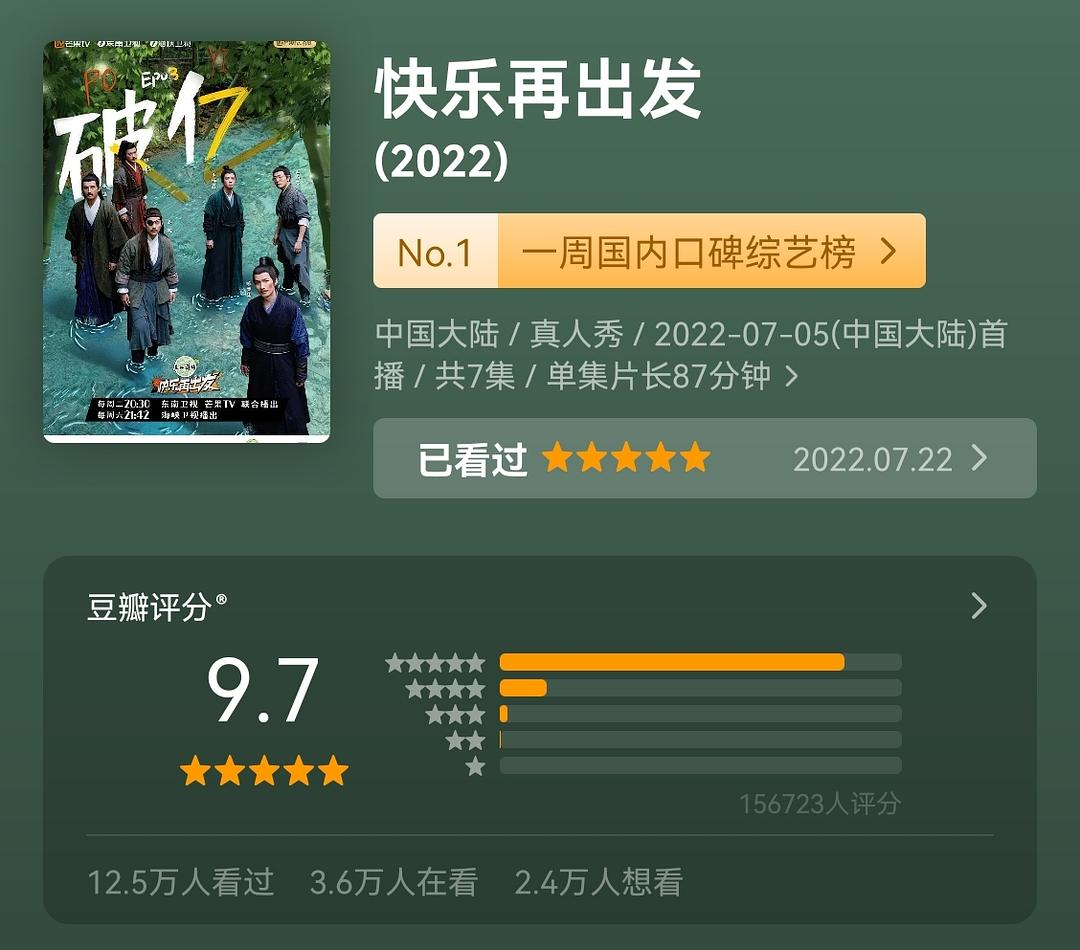 我以为近些年的电视节目都逃不开高开低走的魔咒,万万没想过还有高开疯走的这种情况,《快乐再出发》从开分9.5到现在的9.6,目前已有14w+的豆瓣评分,五星率依然保持在85%以上,这说明什么?nn插播一条喜讯,就在晚上发完这篇长评后,今天凌晨豆瓣评分已升到9.7,评分人数达15w+,已然超过霸榜已久的韩综!!!nn