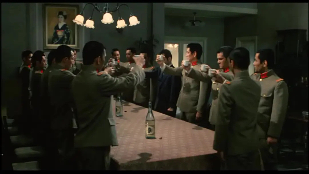 画外音:日本陆海军借二·二六事件之机,树立了军部独裁的法西斯政权,一年之后,对中国挑起全面战争。日本青年们被一个个拉上战场。