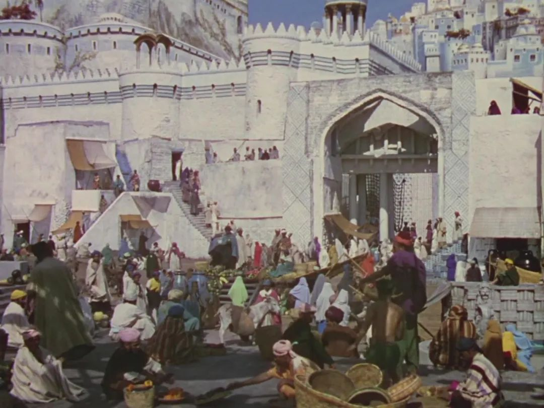 值得注意的是,彩色电影出现的年代是1939年左右,所以《巴格达妙贼》可以说是第一批吃上彩色电影红利的影片,尽管是色彩的先行者,本片对于色彩的运用可是毫不生涩,一个绚烂奇幻的异域世界在影片中被徐徐展现而出,琼·杜普雷扮演的公主在各种靓丽服饰的映衬下更是美丽得不可方物。