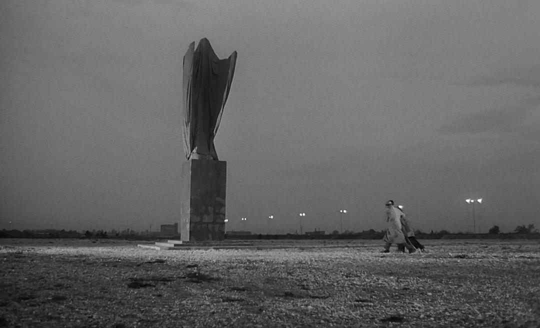 当K最后被处决,从城市中心的教堂被带到郊外的过程,画面中先是出现城市中心充满历史感的老街区,接着是到了新建的现代化的建筑物,然后到了郊外的小平房,接着出现了这尊雕像,接着建筑物完全消失,只剩下苍茫的自然景象。这尊雕像就是K所见的最后的建筑物——最后的人类建构,最后的无人的郊外这时候不仅仅呈现出没有边界、没有约束的样子,同时更呈现出一种荒漠般的荒谬感和无意义,这尊雕像就标志着人类文明社会建构和外部的实存的分界,一旦K经过这尊雕像,被带入荒谬的郊外,就意味着他最后的斗争的来临。