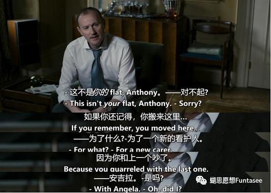3. 第三层-安妮视角:这一层是最精彩的!通过客观时间线梳理,我们知道曾经安妮与詹姆斯离婚后,她将父亲接回了安东尼家中继续照顾他。安东尼因犯病,在自己家中问出“这是自己的公寓吗” ,作为女儿,潜台词“可怜的父亲,这里就是你的家,你连自己的公寓也分不清了吗”