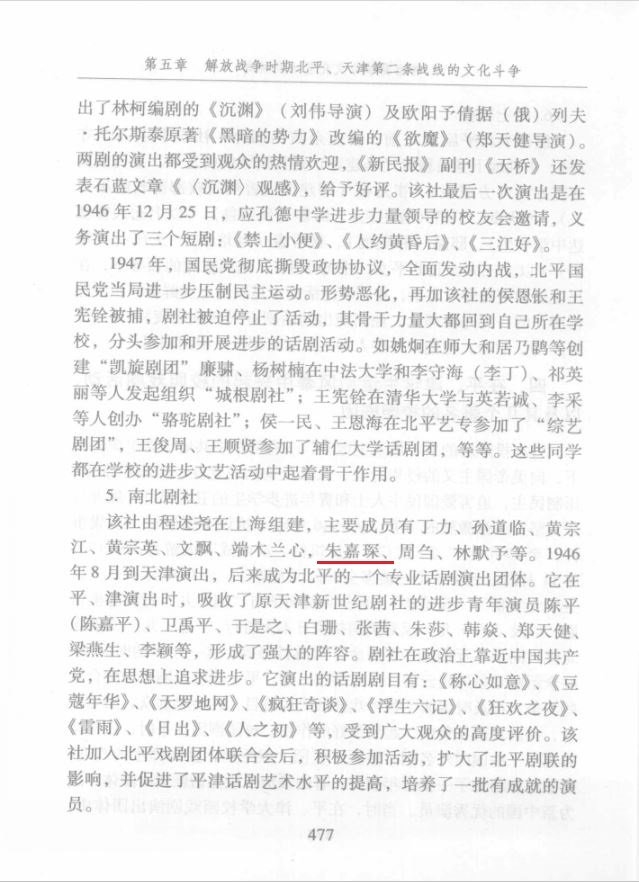 据刘谷主编《晋察冀革命文化艺术发展史》中的第三章“解放战争时期北平、天津第二条战线的文化斗争”记载,在解放前朱嘉琛女士即为我党领导下的进步戏剧社员(后面另有材料证明其为我党在敌后活动的地下工作者),因此可以解释为何在49后留了下来的原因。