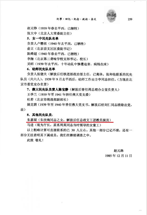 此外,该书写于1980年代,在之前的风波中因故去世的人,都做了标注,但对朱嘉琛女士做的说明中未见到其遭遇不幸之记载,故推测此女士很有可能直至今日一直健在,据其工作单位所在地推断其有可能一直生活在北京。