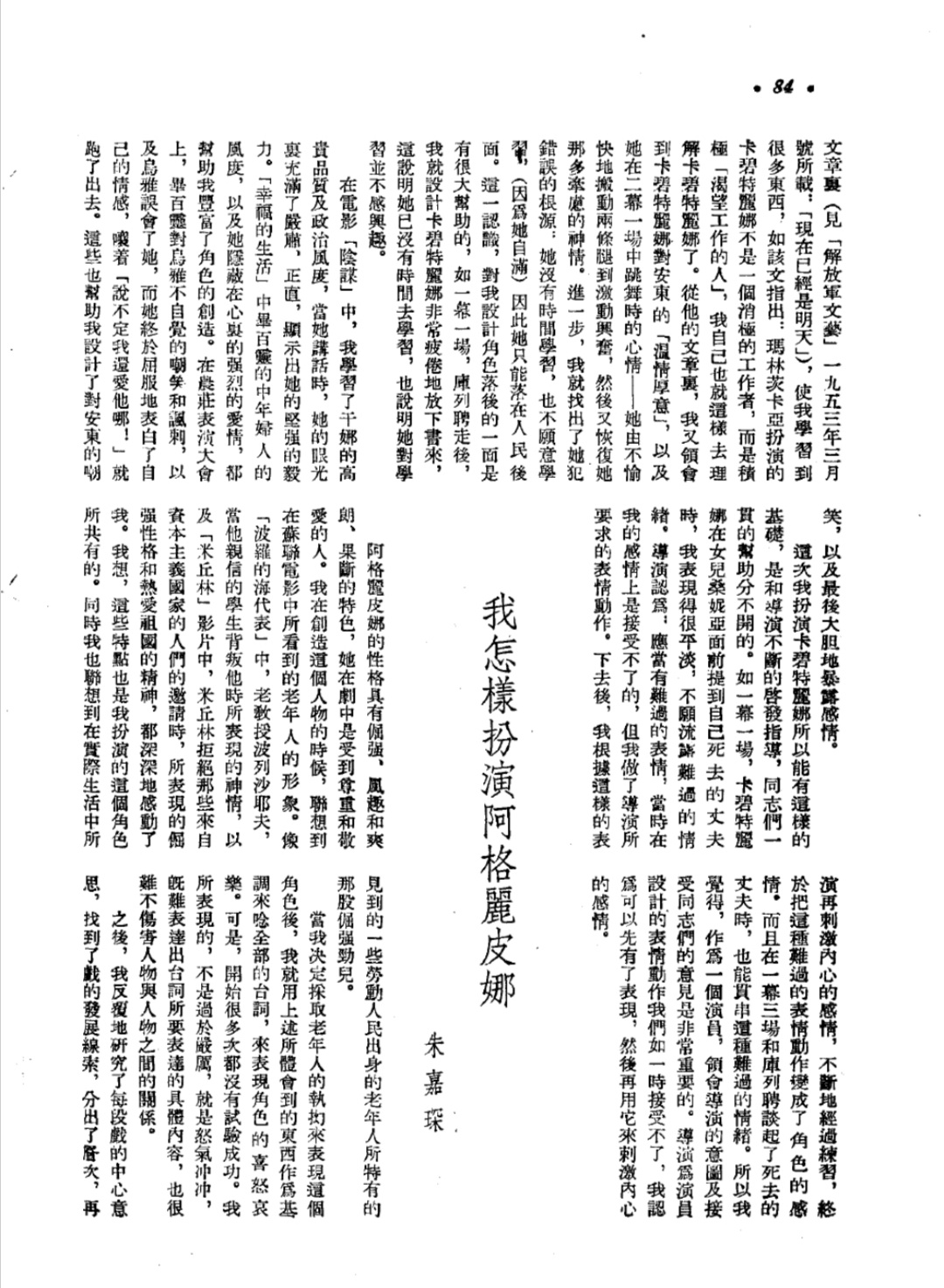 現在切到1953年,我直接找到了一則朱嘉琛寫的文章,發表在解放軍軍藝上。題目是《我怎樣扮演阿格麗皮娜》,原文如下: