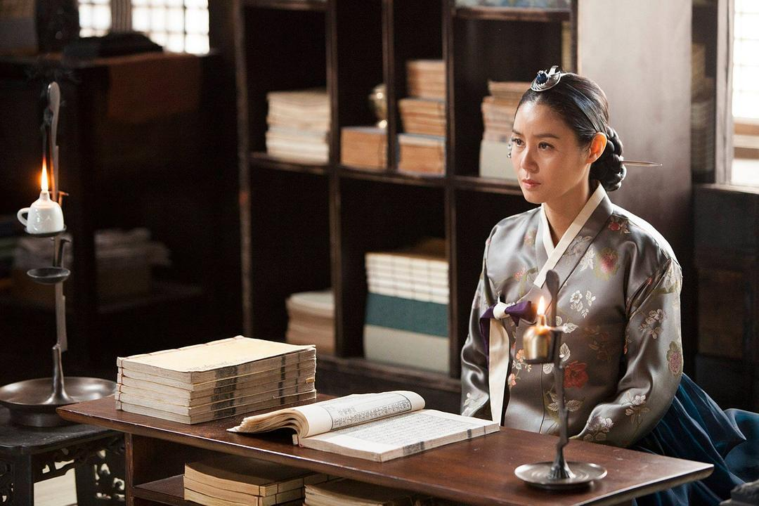 韩志旼饰演的贞纯王后在这部电影里负责美艳妖惑的部分,第一场戏是清晨的白衣纤足,第二场戏是中午的湿衣玉腿,第三场戏是晚上的玉肌裸背,第四场戏里王大妃终于穿好衣裳了,织金通袖官绿袄子配紫酱红织金马面襴裙,明宫命妇的打扮,端庄华贵。