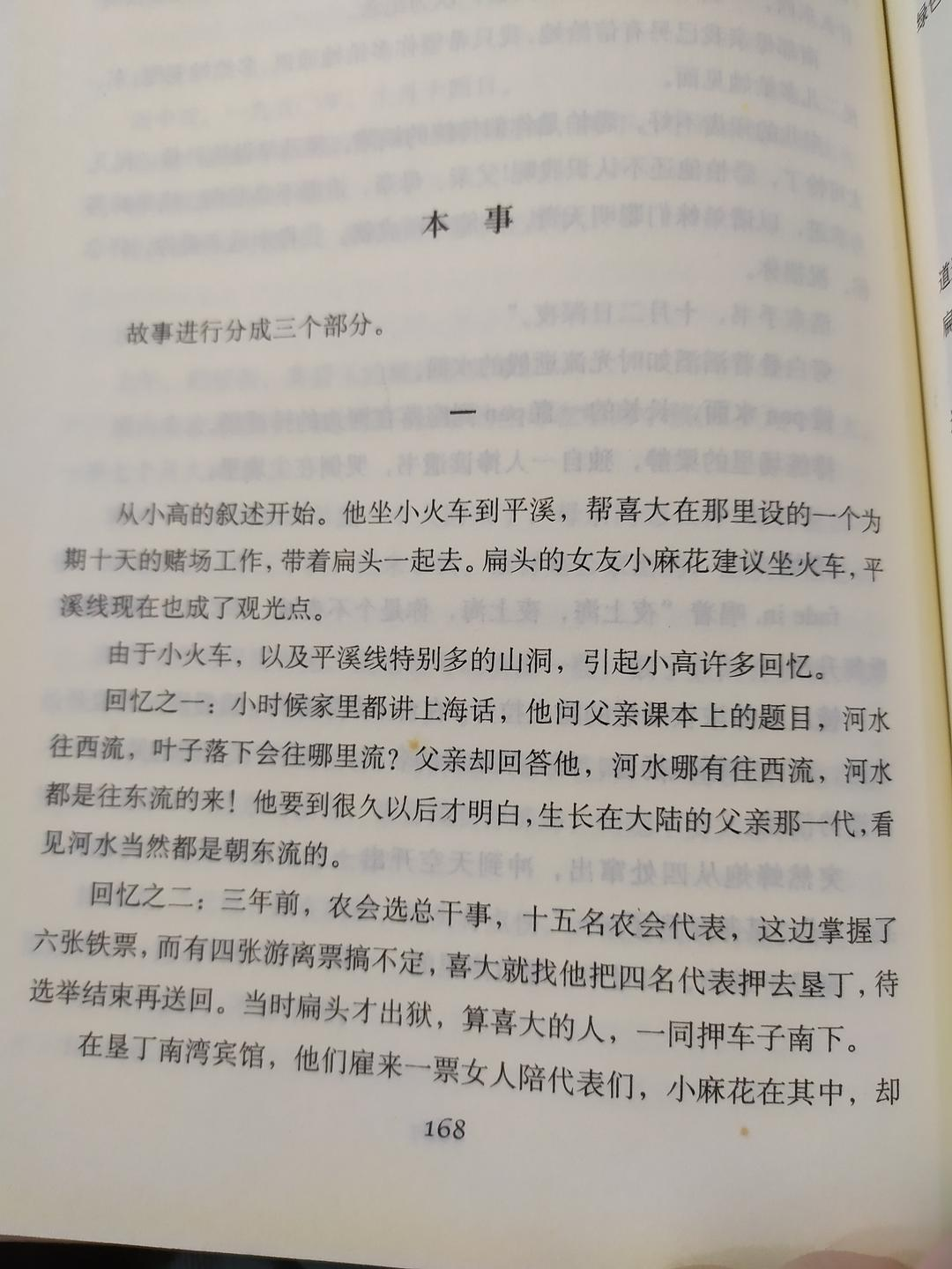 有一个地方,32)段蹲在台阶上吃饭,夹着菜一会儿喂狗,一会儿喂自己。筷子颠倒了几次,还是乱了。在这儿,我略微觉得有点炫技,透出了小聪明。我觉得,如果他具备这个卫生意识的话,就会记得。