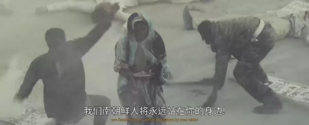 镜头透过浓浓的烟雾记录了束手无策的平民被暴打的场景,广播声音放着:“家人像朋友一样,朋友像家人一样。”画面却放着男人被拖行留下的一道血痕、女人捧着一只鞋绝望痛哭······