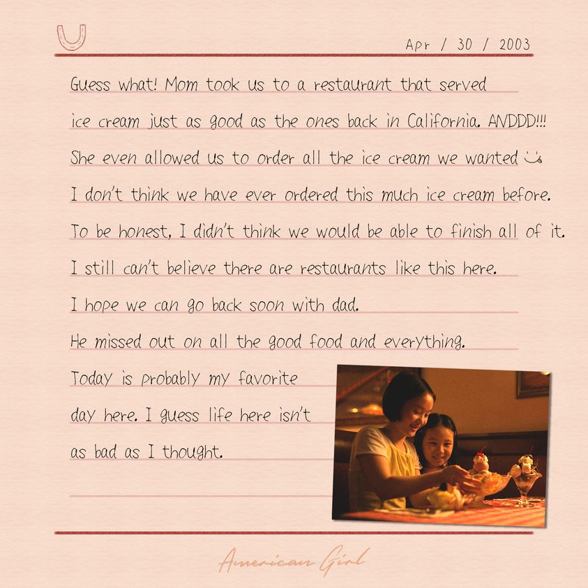 有時電影要表達的東西很簡單,是生活化與普世價值。家家都有本難念的經,瑣碎的事也可以轉化為劇本,成為大家共鳴的事情,一家人吵吵架,小時候被父母體罰、摔門、騎自行車、吃爸爸不知所謂的料理,各種埋怨、大約在戲裡芳儀的年紀媽媽曾經要入院做手術,每一樣也似曾相識,當時是如何渡過的?明知爸爸工作辛苦為何不懂事怨他煮的東西難吃,現在明白少不更事,到長大後家裡出現問題,就更明白長輩默默撐起這頭家,肩負起責任。有很多東西要長大才會明白自己多幸福,看《美國女孩》難免有情感投射,不再單純是一部電影,而是說生命的無常與入世,亦是很多家庭的寫照,一家人埋怨過去仍然會生埋怨,討厭誰誰誰,然而當事情發生後大家會有轉變,患難生忍耐。與導演是同代人,即使在不同語境下也會有共鳴,成長的苦楚,不同年代的會觸碰到。