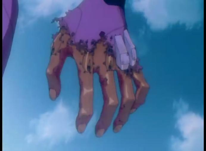 截图非常不清楚,其实是零号机被烧得露出了素体。这个烧伤程度要比原作厉害。