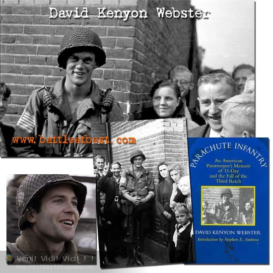 11.大卫韦伯斯特,1922年6月2日在纽约出生,1961年9月9日加利福尼亚州圣莫尼卡失踪在海上(年仅39岁)。 1942 年至1945年服役于第101空降师506伞兵团2营E连退伍军衔一等兵。1943年之前他自愿加入伞兵,他本来有机会完成他在哈佛大学英语文学专业的学业。最初韦伯斯特是在F连完成的新兵训练,在D日之前他被要求加入到E连。直到1945年战争结束。在D日登陆,他和其他人一样没有在预定地点降落。他也参加了荷兰市场花园行动,在行动中被机枪打中腿部受伤。回到英国治疗,因此韦伯斯特错过了巴斯通之役。1945年2月他被允许回到自己的连队。当他重新回到E连,他发现兄弟们一点不像刚打完胜仗的英雄,他们充满疲惫,他失去了很多兄弟。大家对他产生了隔阂。在参加一次巡逻任务后,重新获得了兄弟们的信任。在这不久,E连发现了考弗林集中营和梅明根集中营。对这场战争有了新的理解。战争结束后,他成为华尔街日报和洛杉矶每日新闻的记者,并开始研究海洋学和海洋生物。他整理了他的战时回忆录,并偶尔在杂志上发表了一些文章。1951年他于芭芭拉结婚,并有三个孩子。他对海洋和鲨鱼特别感兴趣,这也最终可能导致他的死亡。1961年9月9日加利福尼亚州圣莫尼卡的海上失踪,很多人认为韦伯斯特可能已经被淹死。至此韦伯斯特的战时日记和想法仍然未发表。直到1994年根据回忆录和日记出版的伞兵:一个美国伞兵的回忆录"D-日和第三帝国的秋季发表。后言:有资料说韦伯斯特的家庭富裕,并且他的父母也帮他在美国本土谋得了一名军官。如果真是这样,韦伯斯特作为富家子弟参加战争惧怕战争。