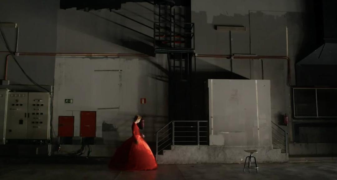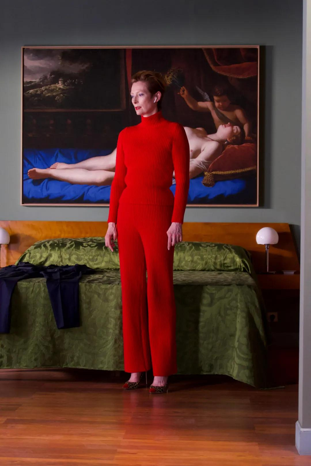 第一个镜头,在灰暗空旷的仓库里,蒂尔达·斯文顿身穿一袭华丽红裙,怅然若失地在一把木椅上坐下。此时的她,碎发凌乱,眼神空洞。画面一转,她又换成一身黑袍,呼吸沉重。
