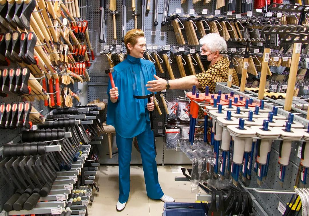 随后故事正式展开。身穿明亮蓝色西服的蒂尔达·斯文顿,面无表情地牵着家养的边牧犬,到商店买了一把斧子。